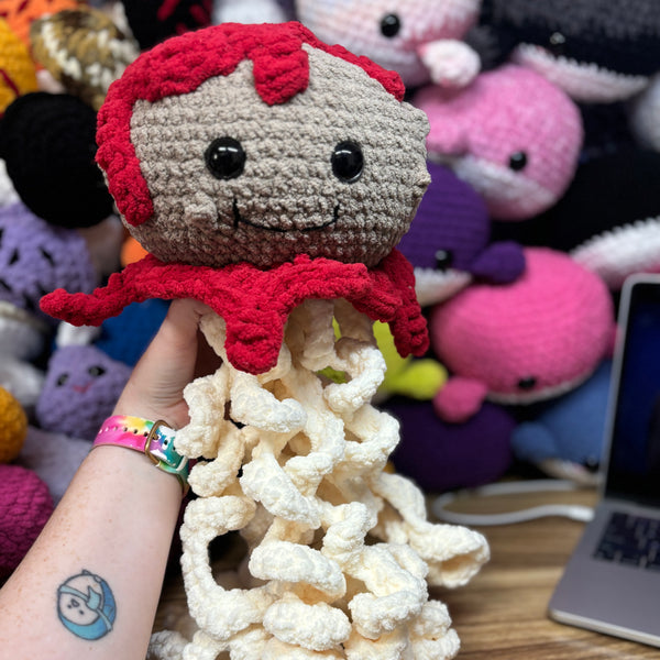 On top of the ocean, all covered in sauce, this meatball jellyfish with Crochetti tentacles is sure to please!