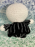 Tiny slashers stand approximately 14 inches tall (36 cm). They are made with polyester yarn. Depending on the style selected, eyes are either plastic safety eyes or felt eyes that are hot-glued onto the face. Due to the fabric paint, it is recommended to spot clean only.